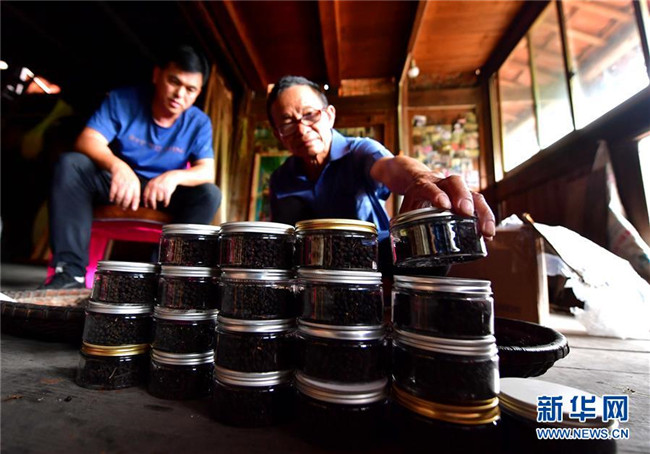 在黔桂烏英苗寨,村民在包裝當(dāng)?shù)匾吧纳缴n子(10月10日攝)。