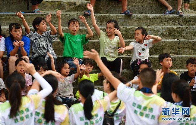 黔桂烏英苗寨的孩子們?cè)诎拈T(mén)志愿者的指導(dǎo)下練習(xí)表演(8月10日攝)。