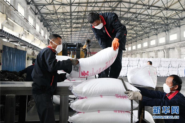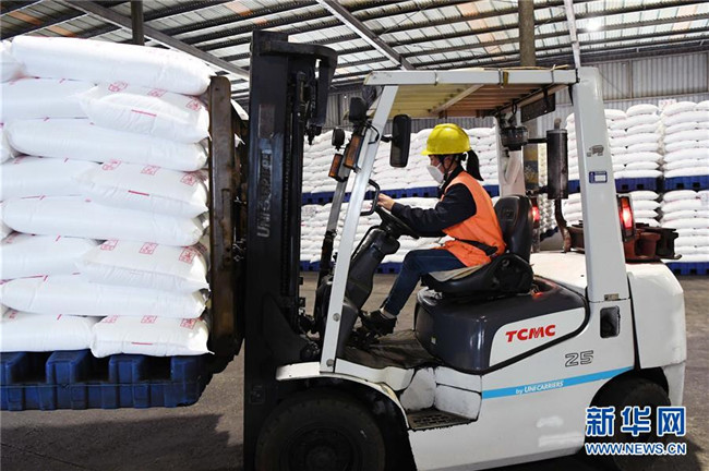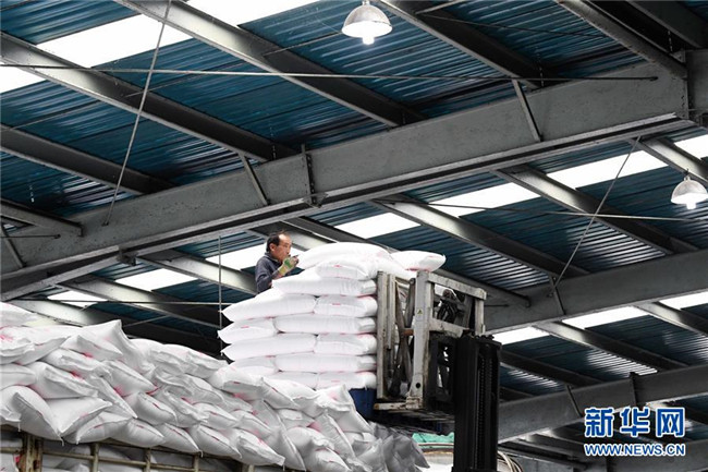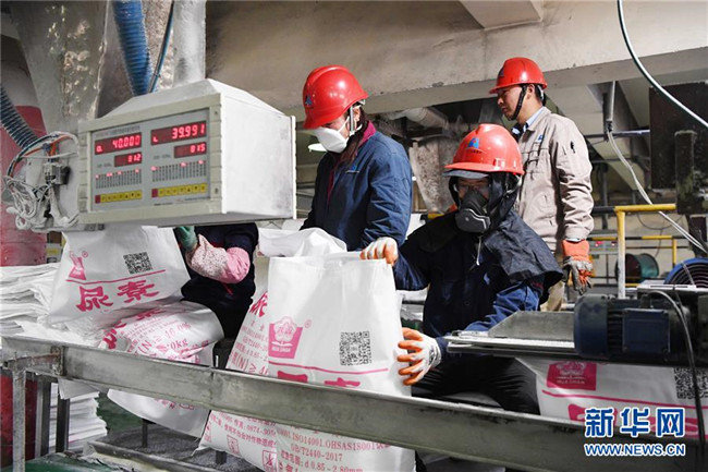 10月14日,轉移就業(yè)的農民在云南省曲靖市沾益區(qū)花山街道勞務中心尿素包裝裝卸車間工作。