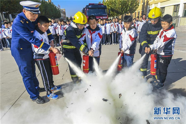11月8日,消防員在河北省大廠回族自治縣城關(guān)小學(xué)指導(dǎo)學(xué)生們使用消防設(shè)備。 新華社記者李曉果攝