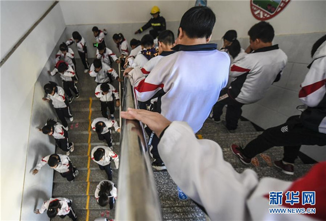 11月8日,河北省大廠回族自治縣城關(guān)小學(xué)的學(xué)生們在校園內(nèi)參加模擬逃生演練。新華社記者李曉果攝