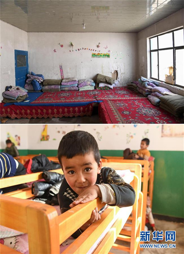拼版照片:上圖為易地扶貧搬遷前的于田縣達里雅布依鄉(xiāng)學校學生宿舍(2018年9月5日攝);下圖為5歲的阿不都沙拉木·庫爾班在新學校午休(2019年11月19日攝)。新華社記者胡虎虎攝
