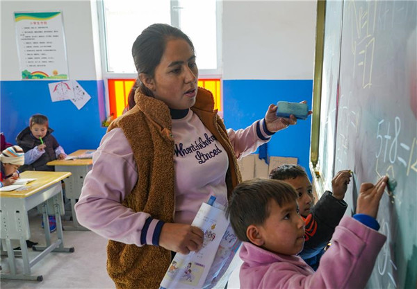 11月19日,在新疆于田縣達里雅布依鄉(xiāng)易地扶貧搬遷安置點的新學校,數(shù)學老師艾比拜木·吾布力艾山(中)在輔導一年級學生做計算題。新華社記者沈伯韓攝