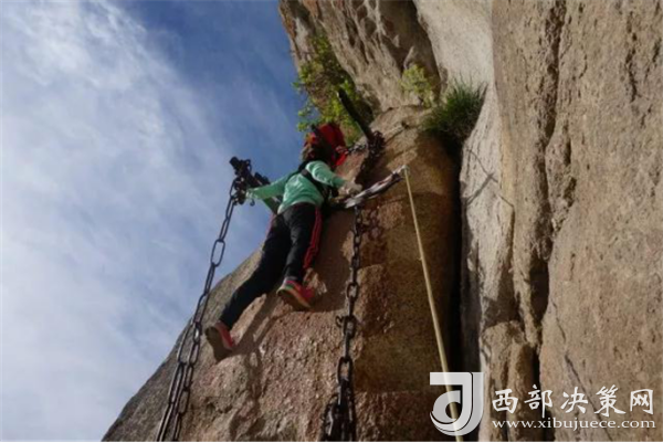 長空棧道:“長空棧道”可謂華山險道之首,它尤如一道奇異的仙練鑲嵌在南峰絕壁。明代“后七子”之一的李攀龍《太華山記》載:“出南天門向西就是棧道,棧雖有銅柱鐵索攔護(hù),然闊不盈尺。行二十余丈方至盡頭。下折為井,高約三丈,旁出復(fù)為棧……”置身其中,直覺背空腳虛,發(fā)豎氣閉,寒風(fēng)沖襠,骨松筋緊,膽大者有凌空欲飛之感,膽弱者心生抵近鬼門之憂。多少年來“長空棧道”以它特有的絕險情懷召喚著天下英雄豪杰一試身手,體驗(yàn)驚心動魄,揮灑豪邁人生。