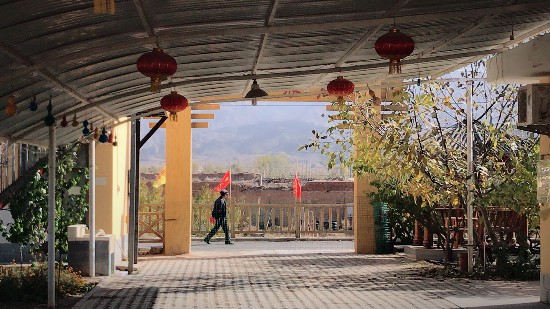 走進沙坡頭新村童家園子,黃墻紅瓦的農(nóng)宅,干凈整潔的道路,各種果樹掩映中,一座座小院各有特色。因為天氣轉(zhuǎn)涼,過了旅游季,大部分的農(nóng)家小院已經(jīng)歇業(yè),只有兩三家還在開門營業(yè)。