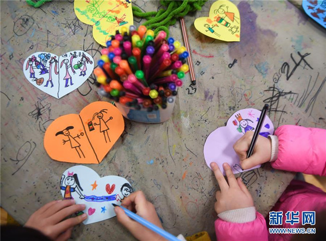 12月11日,小朋友在老師的帶領下繪制愛心卡片,準備隨圍巾一起寄給西藏的小朋友們。 新華社記者 徐昱 攝