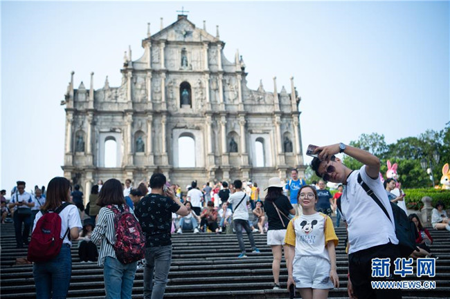 10月8日,人們在澳門大三巴牌坊前游覽。新華社記者 張金加 攝