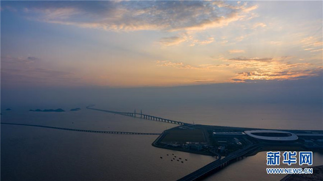 晨曦中的港珠澳大橋珠澳口岸人工島(10月24日無人機拍攝)。新華社記者 張金加 攝