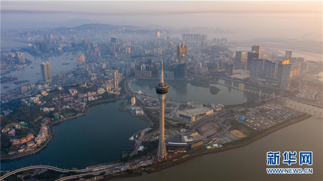 11月18日無人機拍攝的澳門旅游塔、西灣湖、南灣湖景色。新華社記者 張金加 攝