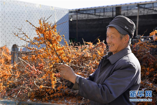 12月18日,當(dāng)?shù)厝罕娫谇逅涌h野生沙棘保護地采摘沙棘果。 新華社記者 徐欽 攝