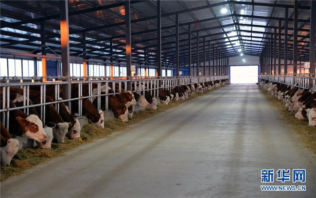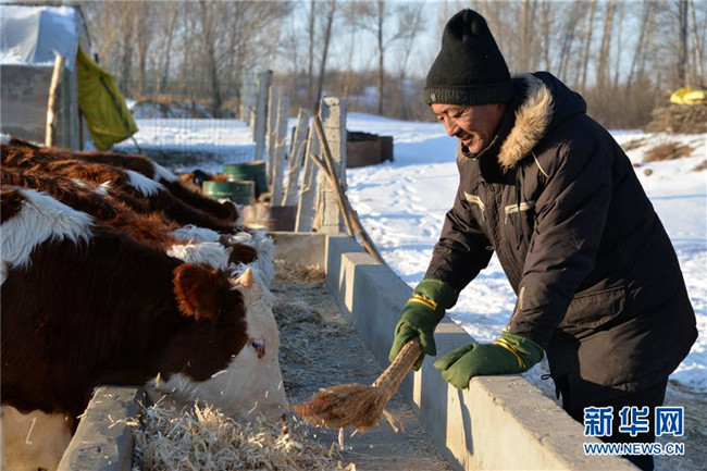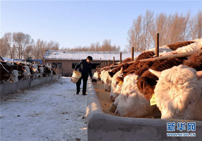 12月19日,科左后旗巴嘎塔拉蘇木劉金山養(yǎng)牛合作社的管理員劉德全在查看黃牛長勢(shì)。新華社記者徐欽攝