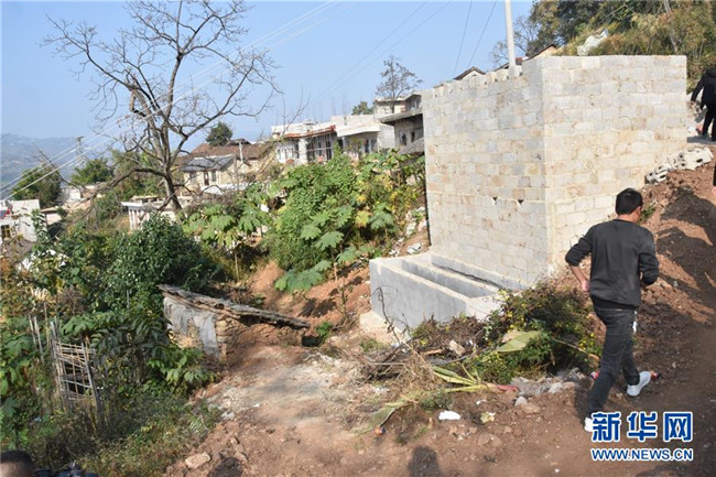11月21日,貴州省畢節(jié)市威寧彝族回族苗族自治縣新發(fā)鄉(xiāng)松發(fā)村,老式低矮的廁所旁邊是扶貧工作隊(duì)新建的小公共廁所。新華社記者 段羨菊 攝