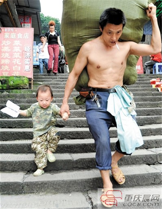 “朝天門市場的‘棒棒’里頭,要說冉師傅是第一,應(yīng)該沒人有意見!”在大生商場做了二十幾年商販的吳慶元篤定地說,幾百個“棒棒”中,就數(shù)冉光輝收入最高。他說,冉師傅一般不得講價,經(jīng)常是二話不說先擔(dān)貨,再收錢,不像有的棒棒,錢少了不肯去。通常老板們不會虧待他,就算給的錢少了,他也總是憨憨笑幾聲,“沒啥,力氣嘛,用完了還會有。”