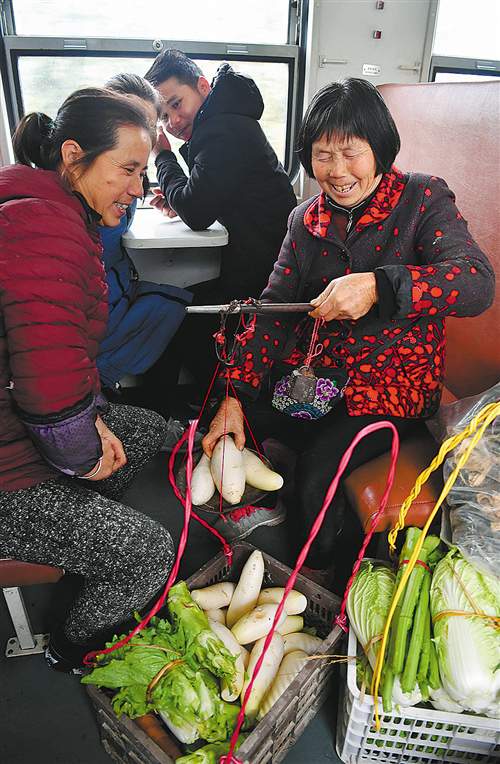 7269次列車(chē)車(chē)廂里,湖南省靖州苗族侗族自治縣太陽(yáng)坪鄉(xiāng)八龍村一組的71歲苗族婦女楊炳英(右)正在為旅客稱菜。楊炳英是該村建檔立卡貧困戶,已經(jīng)乘坐“慢火車(chē)”賣(mài)菜10多年,每月能有2000多元的收入。她開(kāi)心地說(shuō):“扶貧列車(chē)真好,既能掙錢(qián),又可觀光。”