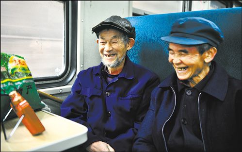 在7270次列車(chē)上,湖南省靖州苗族侗族自治縣的汪家(右)與楊永燦,在行駛的列車(chē)車(chē)廂里開(kāi)心地觀看“小電視”。