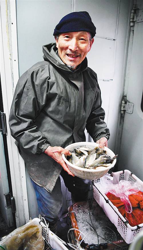 懷化至梅江的7272次列車(chē)車(chē)廂里,80歲的符長(zhǎng)理老人帶著剛剛捕撈的魚(yú)蝦,乘車(chē)前往貴州省銅仁市菜市場(chǎng)銷(xiāo)售。