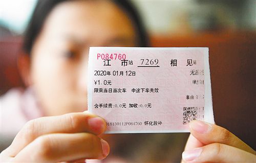▲江市站開(kāi)往相見(jiàn)站的7269次列車(chē)上,一名旅客展示自己的車(chē)票,票價(jià)只有1元。列車(chē)最高票價(jià)11元。