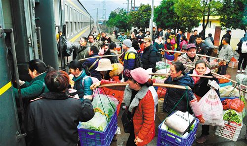 ▲??吭诤鲜÷殛?yáng)郭公坪站的7272次列車(chē),當(dāng)?shù)毓r(nóng)菜農(nóng)挑著擔(dān)子準(zhǔn)備上車(chē)。這趟“慢火車(chē)”所經(jīng)過(guò)的地區(qū)多為“老少邊窮”,經(jīng)濟(jì)欠發(fā)達(dá)。為盤(pán)活沿途百姓致富渠道,鐵路部門(mén)開(kāi)“綠燈”允許乘客攜帶大量鮮活貨物乘車(chē)。