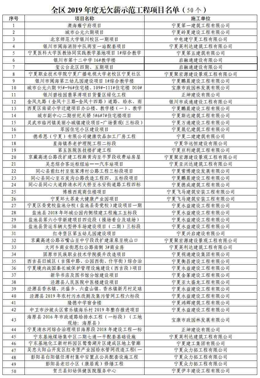 1月16日,記者從寧夏人力資源和社會保障廳獲悉,我區(qū)發(fā)布《關(guān)于2019年度全區(qū)無欠薪示范工程項目的通報》,對50個認(rèn)真履行農(nóng)民工工資支付各項政策的在建工程項目給予表揚(yáng)及企業(yè)誠信考核加分。