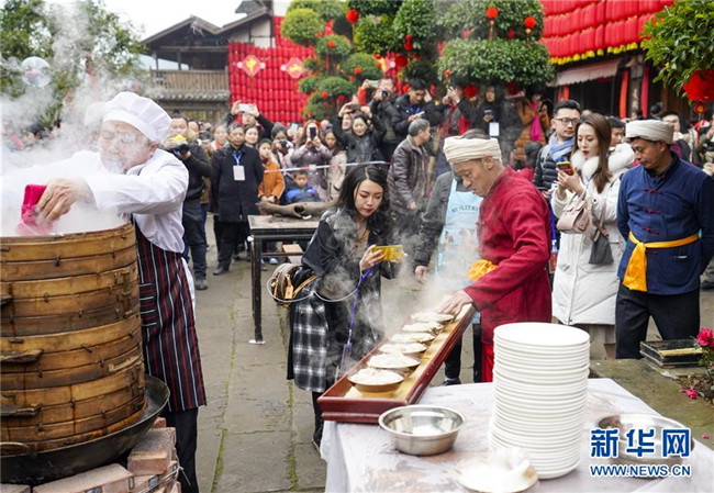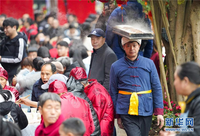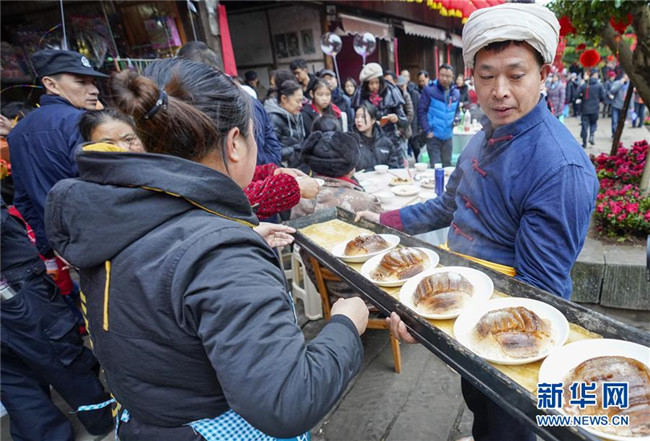 1月18日,在中山古鎮(zhèn)的“千米長宴”上,民間藝人用古鎮(zhèn)傳統(tǒng)“打盆”絕藝給游客們上菜。當日中午,伴隨著一聲“開席嘍”,一年一度的“千米長宴”在重慶市江津區(qū)中山古鎮(zhèn)舉行。噴香的煙熏豆腐、軟糯的夾燒肉、可口的石板糍粑……800余桌年味十足的特色美食,吸引了兩萬多名游客前來體驗傳統(tǒng)民俗,感受“一雙筷子吃遍一條街”的暢快淋漓。中山古鎮(zhèn)自古就有“千米匯長宴萬人祈福祉”的習(xí)俗。每年春節(jié)期間,古鎮(zhèn)老街居民都會在千米長街上大擺“百家宴”,祝福生意興隆、家業(yè)興旺、風(fēng)調(diào)雨順、五谷豐登。新華社記者劉潺攝