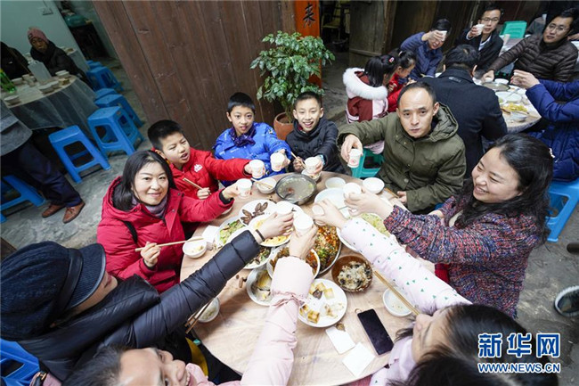 1月18日,游客在中山古鎮(zhèn)老街上體驗“千米長宴”傳統(tǒng)美食。當日中午,伴隨著一聲“開席嘍”,一年一度的“千米長宴”在重慶市江津區(qū)中山古鎮(zhèn)舉行。噴香的煙熏豆腐、軟糯的夾燒肉、可口的石板糍粑……800余桌年味十足的特色美食,吸引了兩萬多名游客前來體驗傳統(tǒng)民俗,感受“一雙筷子吃遍一條街”的暢快淋漓。中山古鎮(zhèn)自古就有“千米匯長宴萬人祈福祉”的習(xí)俗。每年春節(jié)期間,古鎮(zhèn)老街居民都會在千米長街上大擺“百家宴”,祝福生意興隆、家業(yè)興旺、風(fēng)調(diào)雨順、五谷豐登。新華社記者劉潺攝