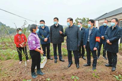 春回大地,正是春耕好時節(jié)。黎明村村民搶抓農(nóng)時,有的在翻耕土地,有的正給田間作物澆水施肥,有的在播種早春玉米,一片忙碌景象。彭清華走進(jìn)村口的花椒基地,與套種茄子秧苗的村民親切交談,詢問栽種面積、土壤墑情、生長周期、市場銷路等情況。他說,一年之計在于春,切實(shí)抓好春耕生產(chǎn)對于實(shí)現(xiàn)全年豐產(chǎn)豐收意義重大。農(nóng)時不等人,要在嚴(yán)格落實(shí)防控措施的同時,及時推進(jìn)春季農(nóng)業(yè)生產(chǎn)和生豬恢復(fù)生產(chǎn),因地制宜調(diào)整種養(yǎng)業(yè)結(jié)構(gòu),確保穩(wěn)產(chǎn)保供和農(nóng)民持續(xù)增收。有關(guān)部門要繼續(xù)做好服務(wù)保障,加強(qiáng)技術(shù)指導(dǎo),強(qiáng)化農(nóng)資儲備、調(diào)劑和配送,搞好產(chǎn)銷銜接,讓生產(chǎn)資料進(jìn)得來、農(nóng)產(chǎn)品賣得出。對隔離觀察群眾要做好生產(chǎn)扶持工作,幫助他們克服困難、不誤農(nóng)時。