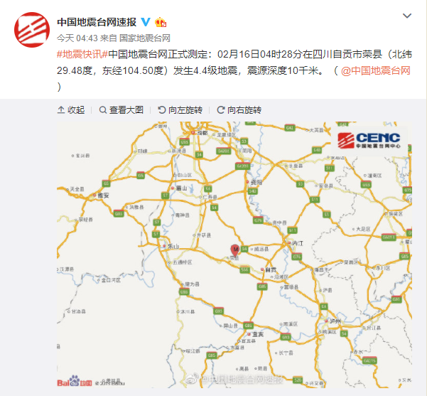 中國地震臺(tái)網(wǎng)正式測定:02月16日04時(shí)28分在四川自貢市榮縣(北緯29.48度,東經(jīng)104.50度)發(fā)生4.4級(jí)地震,震源深度10千米。