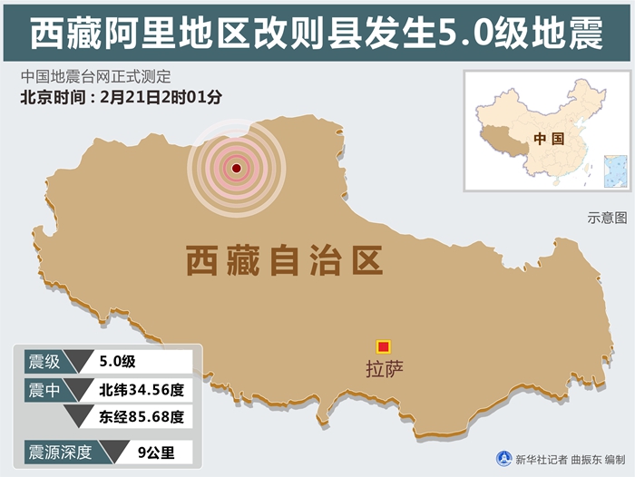 中國地震臺網(wǎng)正式測定:2月21日2時01分,在西藏阿里地區(qū)改則縣(北緯34.56度,東經(jīng)85.68度)發(fā)生5.0級地震,震源深度9公里。