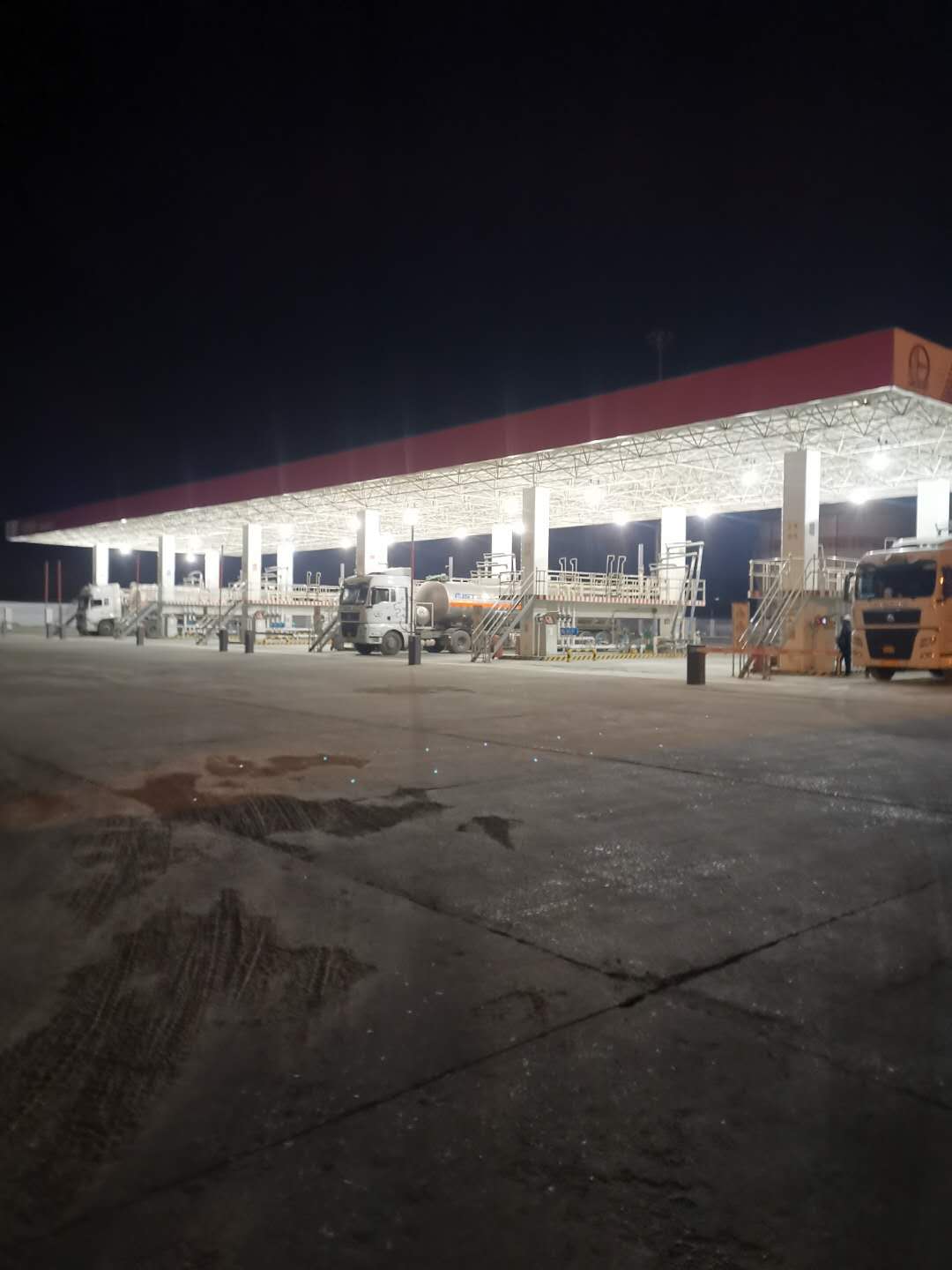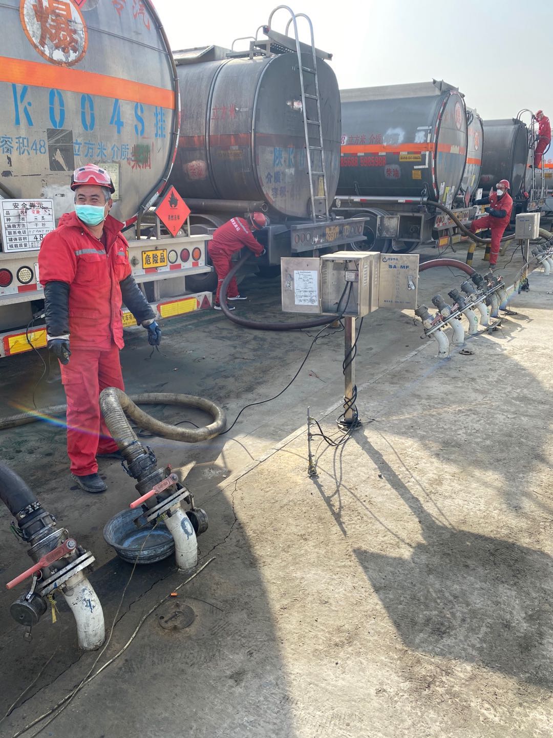 已近零時(shí),空曠的付油區(qū)氣溫早已降至零攝氏度以下。此時(shí),油庫(kù)的發(fā)油作業(yè)依然沒(méi)有停止……油庫(kù)的幾名工友,頭戴紅色安全帽、身著藍(lán)色工裝,對(duì)入庫(kù)油庫(kù)油車進(jìn)行安全檢查,驗(yàn)票員仔細(xì)核對(duì)著票據(jù)信息,引導(dǎo)車輛正確??浚粩嗵崾抉{駛員注意操作安全。