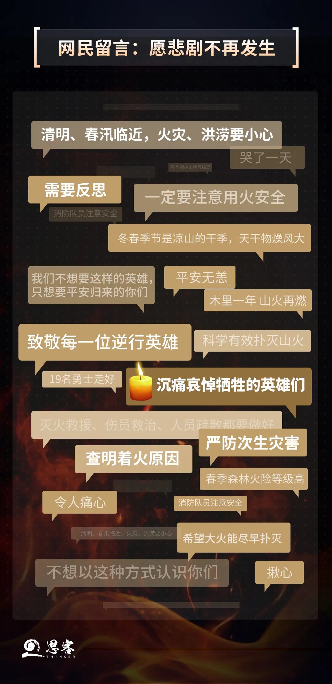 “火災”“英雄”“反思”是網民留言中的高頻詞,“我們不想要這樣的英雄,只想要平安歸來的你們”成為網民共同心聲。逆火而行的英雄值得尊敬,但確保撲火人員安全更是前提。有網民說,一年前,四川木里的那場大火,造成31人不幸犧牲;一年后,又是一場大火,再次奪走19條鮮活的生命。春天天干物燥、山火肆虐蔓延、風向突然變化,兩次火災場景何其相似。我們需要認真反思,加大對風向突變的預判,利用更多科技手段滅火,避免火災“風”險悲劇重演。