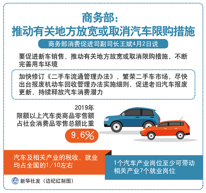 商務(wù)部消費(fèi)促進(jìn)司副司長王斌2日說,要促進(jìn)新車銷售,推動(dòng)有關(guān)地方放寬或取消限購措施,不斷完善用車環(huán)境,加快修訂《二手車流通管理辦法》,繁榮二手車市場,盡快出臺報(bào)廢機(jī)動(dòng)車回收管理辦法實(shí)施細(xì)則,促進(jìn)老舊汽車報(bào)廢更新,持續(xù)釋放汽車消費(fèi)潛力。