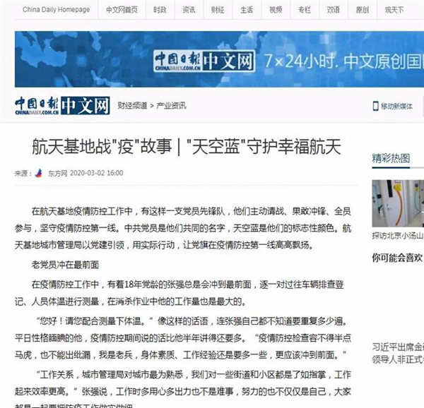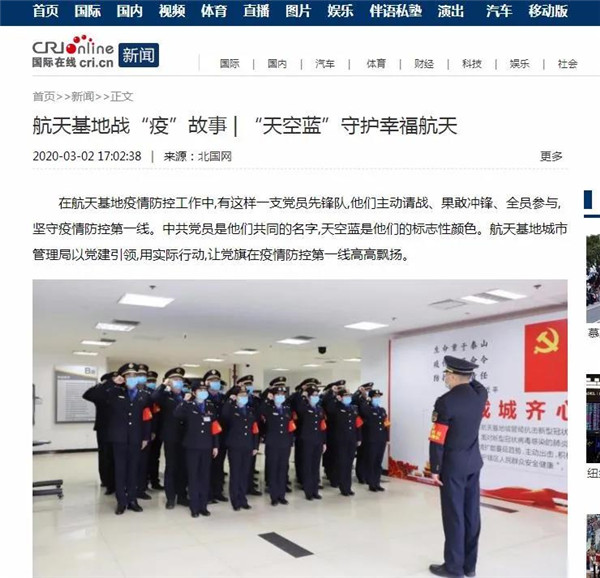 3月2日,航天基地《“天空藍(lán)”守護(hù)幸福航天》,講述了擁有18年黨齡的張強(qiáng)、退役士官魏斌、工作人緣好李鵬飛用行動展現(xiàn)共產(chǎn)黨人政治本色的積極實踐。國際在線、中國日報網(wǎng)、環(huán)球網(wǎng)、鳳凰網(wǎng)、西部網(wǎng)、三秦網(wǎng)、搜狐等近20家中央、省級、市級網(wǎng)絡(luò)媒體轉(zhuǎn)發(fā),網(wǎng)友產(chǎn)生強(qiáng)烈共鳴。