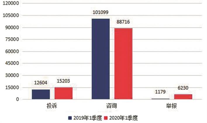 2020年一季度,12315投訴舉報(bào)指揮中心受理全省消費(fèi)者投訴15203件,業(yè)務(wù)咨詢88716件,違法舉報(bào)6230件,共計(jì)110149件(含省消協(xié)數(shù)據(jù)),與2019年同期相比下降了4.1%,其中舉報(bào)量受疫情的影響劇增。已辦復(fù)107026件,辦復(fù)率97.2%,為消費(fèi)者挽回經(jīng)濟(jì)損失637.84萬(wàn)元。西安市、榆林市、咸陽(yáng)市、寶雞市、渭南市的投訴舉報(bào)量位居全省前五位。