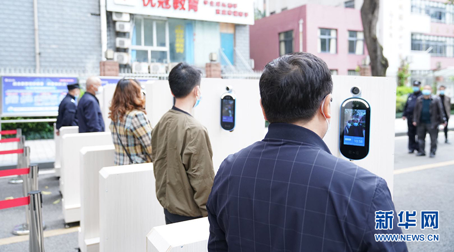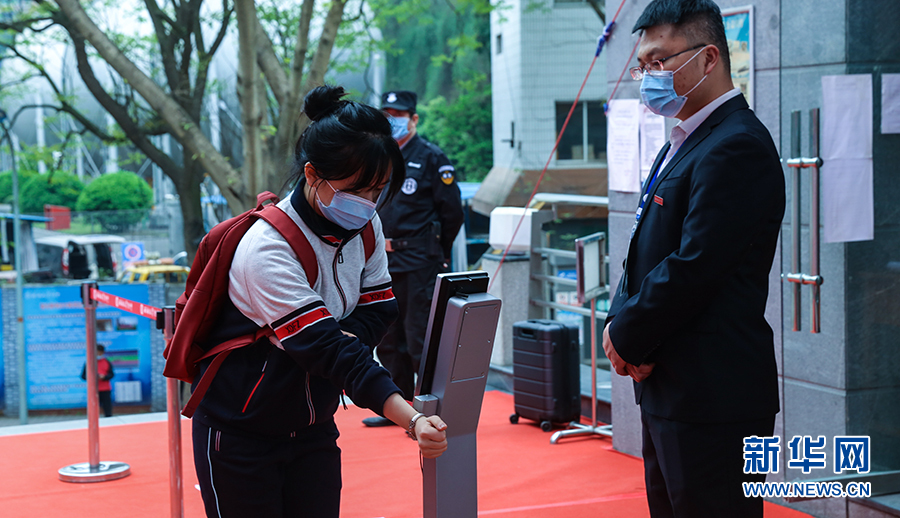 在重慶市第一中學,大校門設置了多條紅外線成像體溫測控通道,能夠快速檢測到師生體溫并清楚顯示。學生從通道經過時,紅外線測溫儀會及時監(jiān)測通過者體溫,若有體溫異常者,設備會報警。圖為學校老師演習進校場景。新華網發(fā)