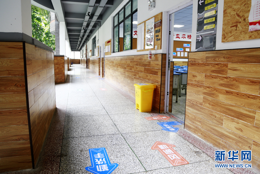 在重慶市第十一中學,為避免人流聚集,在公眾通道處學校設置了行進方向指示標識以引導師生。新華網 彭博攝