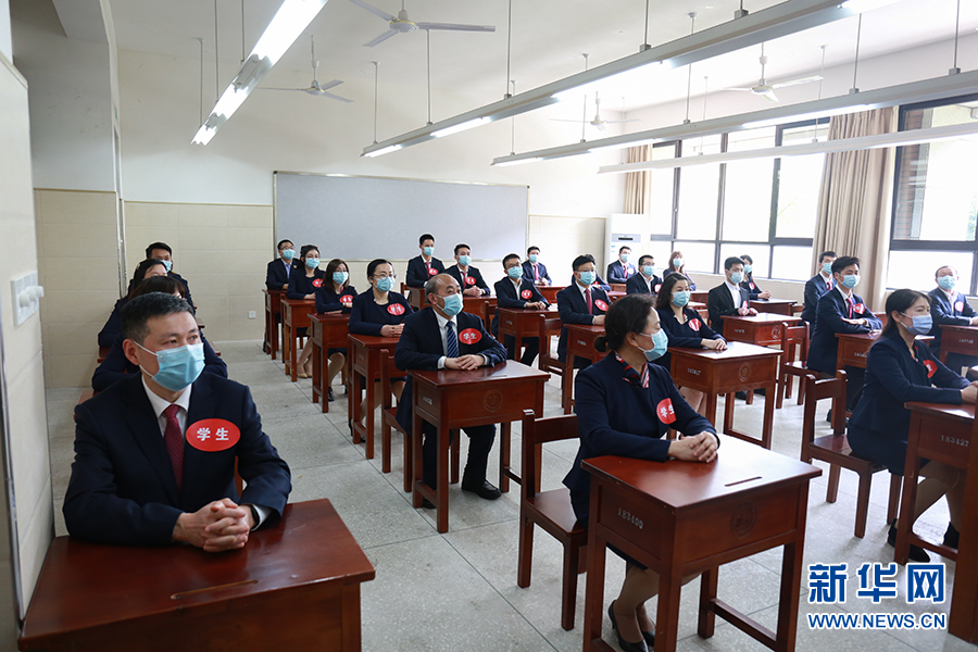 在重慶市第一中學,學生返校時須由值班人員引導指揮,在校門外有序排隊,相互間保持一米的距離,并從專用通道依次有序進入。圖為學校老師演習進校場景。新華網發(fā)