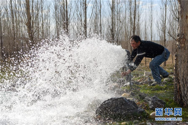 4月19日,在阿勒泰市中水回用環(huán)境治理示范園,工人放水灌溉苗木。新華社記者丁磊攝