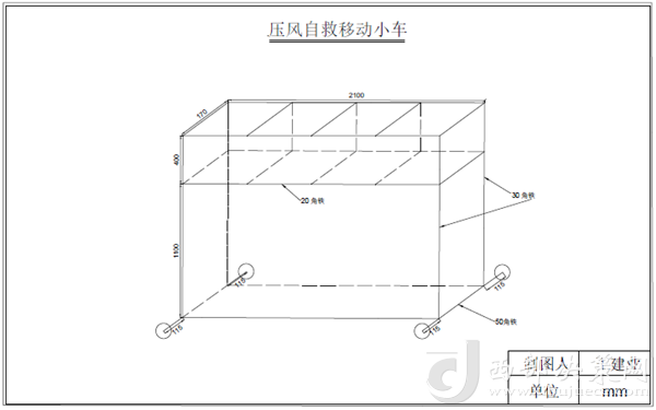 圖紙畫好后,王建業(yè)火速發(fā)給了材料員老王,老王憑借多年的人脈,在車間找來電焊師傅,又拾了廢棄的幾塊角鋼和幾個(gè)車輪,半晌就把王建業(yè)想要的東西給做了出來。其實(shí)很簡(jiǎn)單,根據(jù)壓風(fēng)自救箱的尺寸,利用扁鐵構(gòu)建整體框架,下方安裝四個(gè)滑輪即可投入使用。