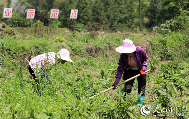 在廣西柳州市融安縣沙子鄉(xiāng)紅妙村,勞務(wù)隊(duì)成員在村集體經(jīng)濟(jì)甘蔗示范點(diǎn)勞作。譚凱興攝