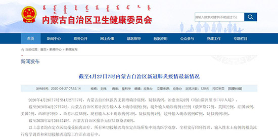 4月27日,記者從內(nèi)蒙古自治區(qū)衛(wèi)生健康委員會(huì)獲悉,2020年4月26日7時(shí)至4月27日7時(shí),內(nèi)蒙古自治區(qū)報(bào)告無(wú)新增確診病例、疑似病例。治愈出院8例(均由滿洲里市口岸入境)。