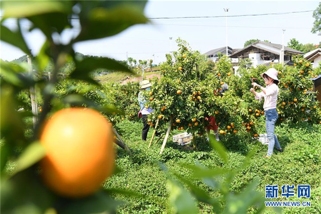 4月29日,在重慶忠縣“三峽橘鄉(xiāng)”田園綜合體內(nèi),游客在果園內(nèi)采摘。新華社記者 唐奕 攝