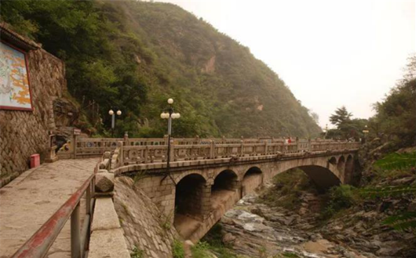 原潭側(cè)巖石上建有廟宇叫五龍宮,宮內(nèi)供有五位龍君,文化革命前殘垣還在,“文革”后徹底毀廢。由于山洪原因,潭逐漸被碎石填塞,今已不復(fù)存在。唯潭上的五龍橋及橋頭上的大型五龍彩色壁畫依然向游人訴說著五龍?zhí)睹利惖膫髡f。橋欄鐫刻的“五龍橋”三字是當時任中共中央書記處書記的胡喬木同志所書。
