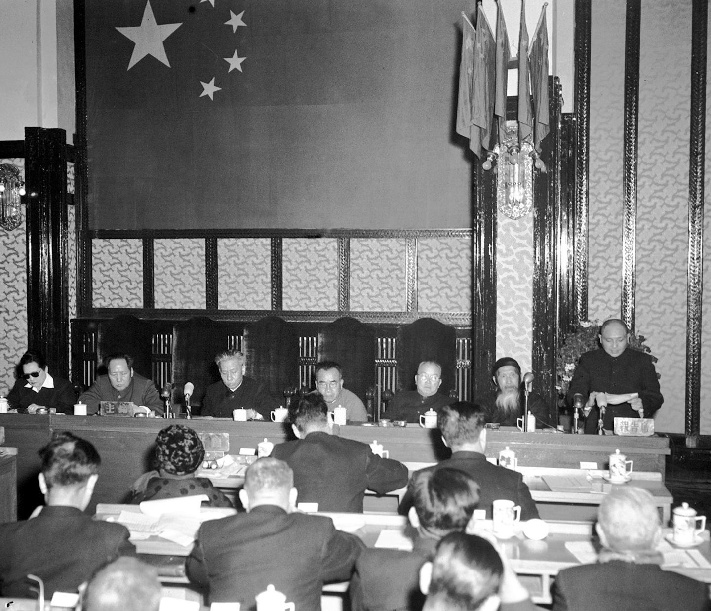 1953年2月11日,中央人民政府委員會(huì)舉行第二十二次會(huì)議。鄧小平(右一)在會(huì)議上作關(guān)于中華人民共和國(guó)全國(guó)人民代表大會(huì)及地方各級(jí)人民代表大會(huì)選舉法的說明報(bào)告。主席臺(tái)上(自左起)宋慶齡副主席,毛澤東主席,劉少奇、朱德、李濟(jì)深、張瀾副主席。