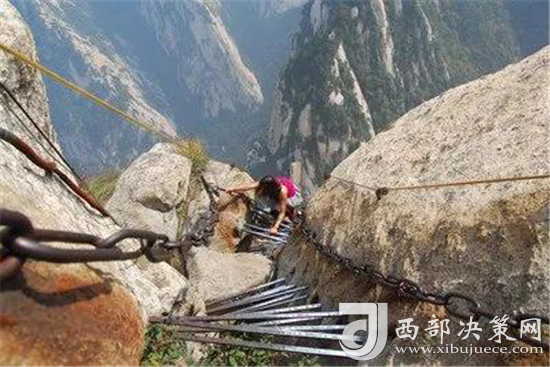 華山還有一處常人不敢涉足的險(xiǎn)境--- 鷂子翻身。鷂子翻身在華山東峰是通往下棋亭的必由之路。其路鑿于懸崖上,下視唯見寒索垂于凌空,不見路徑。游人至此,需面壁挽索,以腳尖探尋石窩,交替而下,其中幾步需如鷹鷂一般、左右翻轉(zhuǎn)身體才可通過。此景只留英雄客,婦孺難聞幾聲咳。這句話現(xiàn)在也未然,巾幗不讓須眉,以后應(yīng)是往來無懼者,皆是英雄客了。