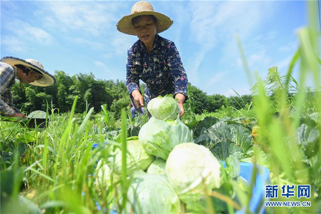 6月4日,在湘潭市雨湖區(qū)鶴嶺鎮(zhèn)龍安村,湘潭市仙女蔬菜產(chǎn)銷專業(yè)合作社的農(nóng)戶在田里采摘包菜。 新華社記者 陳澤國 攝
