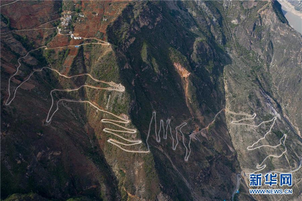 金陽縣蘆稿鎮(zhèn)大灣子村12公里左右的通村公路,28個彎蜿蜒盤旋在金沙江峽谷懸崖絕壁邊(6月7日攝,無人機照片)。坐落在金沙江畔的四川省金陽縣是國家級深度貧困縣,境內群山連綿起伏,海拔落差大,眾多村寨處于高山或者高半山上,道路施工難度大。近年來,當地政府將交通作為脫貧攻堅的先導性工程,路越修越寬、越修越好,成為當地群眾的脫貧致富路。截至2019年底,金陽縣實現所有鄉(xiāng)鎮(zhèn)通油路、建制村通硬化路,鄉(xiāng)道里程達329.9公里,村道里程達866.8公里。新華社記者江宏景攝