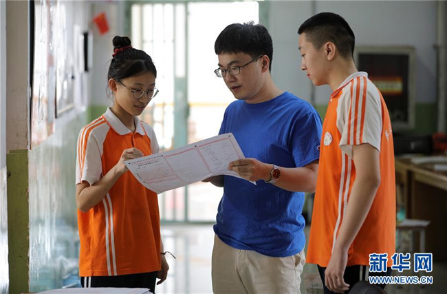 6月18日,河北省衡水市第十四中學高三年級數(shù)學老師(中)為學生講解試題。