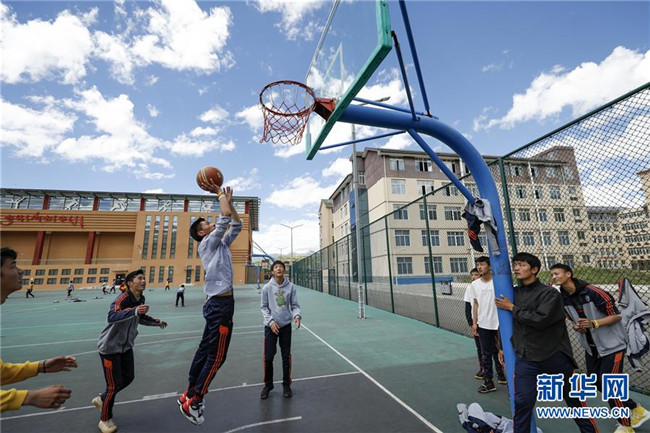 在四川省阿壩藏族羌族自治州阿壩縣藏文中學(xué)新的籃球場(chǎng)上,初中二年級(jí)男生在體育課上打籃球(6月14日攝),周?chē)鷦t是新的教學(xué)樓和體育運(yùn)動(dòng)場(chǎng)館。新華社記者 沈伯韓 攝