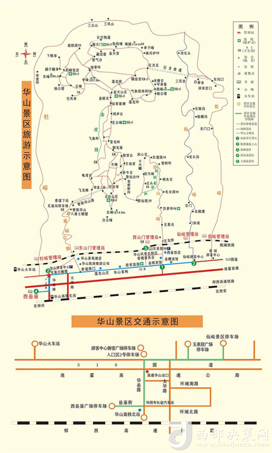 從華山生態(tài)廣場購票處坐旅游專線車,向西沿310國道行約5公里,進入甕峪后行7公里盤山旅游公路,至西峰索道下站,坐索道20分鐘后,直達西峰。