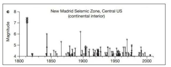 例如,在1811-1812年間,位于北美板塊內(nèi)部的美國(guó)密蘇里州的紐馬德里地區(qū)曾發(fā)生過(guò)三次7.0-7.4級(jí)地震。盡管地震已經(jīng)過(guò)去兩百多年,但一直到2000年為止,該地區(qū)的小震依然很活躍,研究人員認(rèn)為這些小震是大地震的余震。